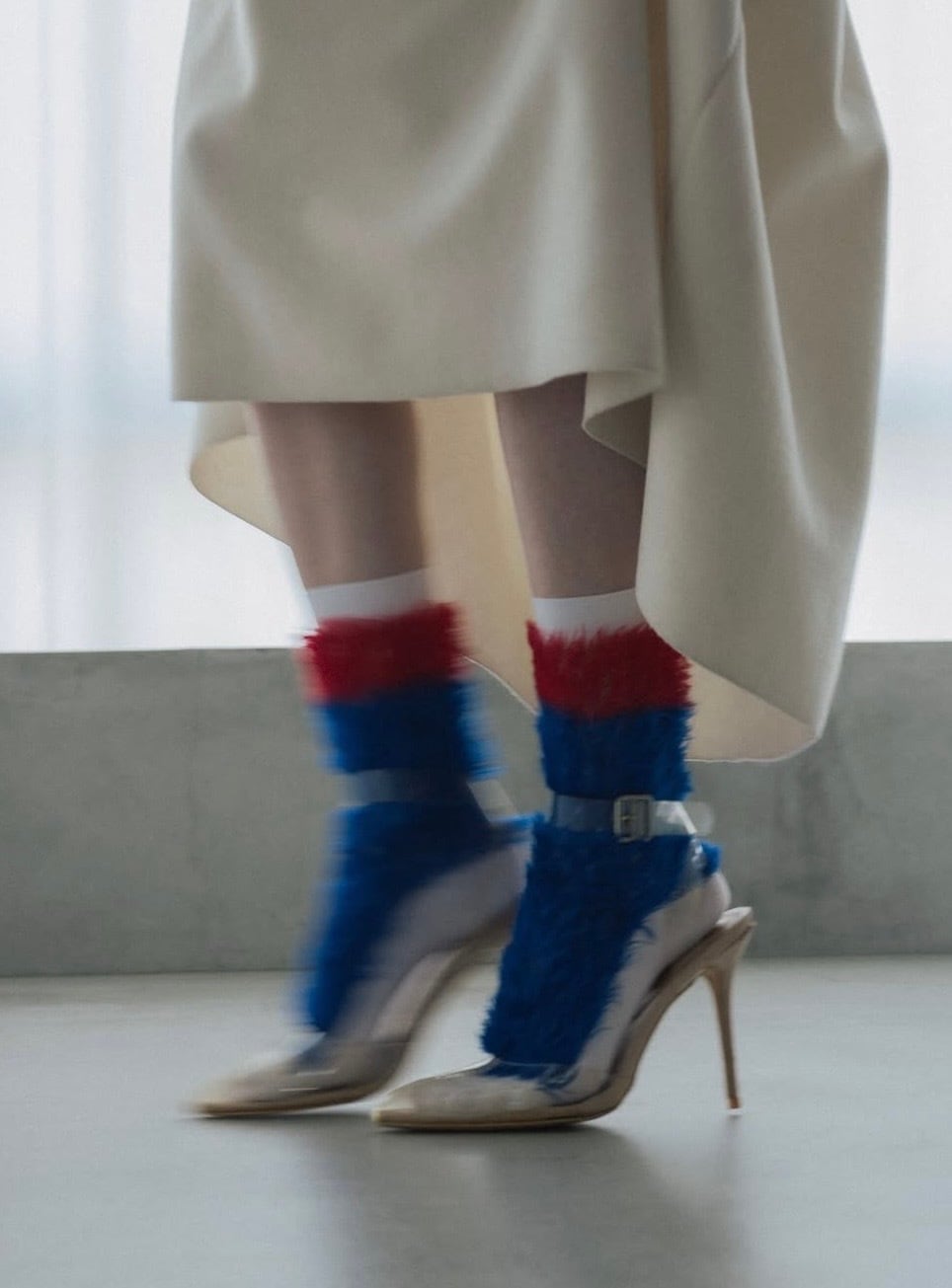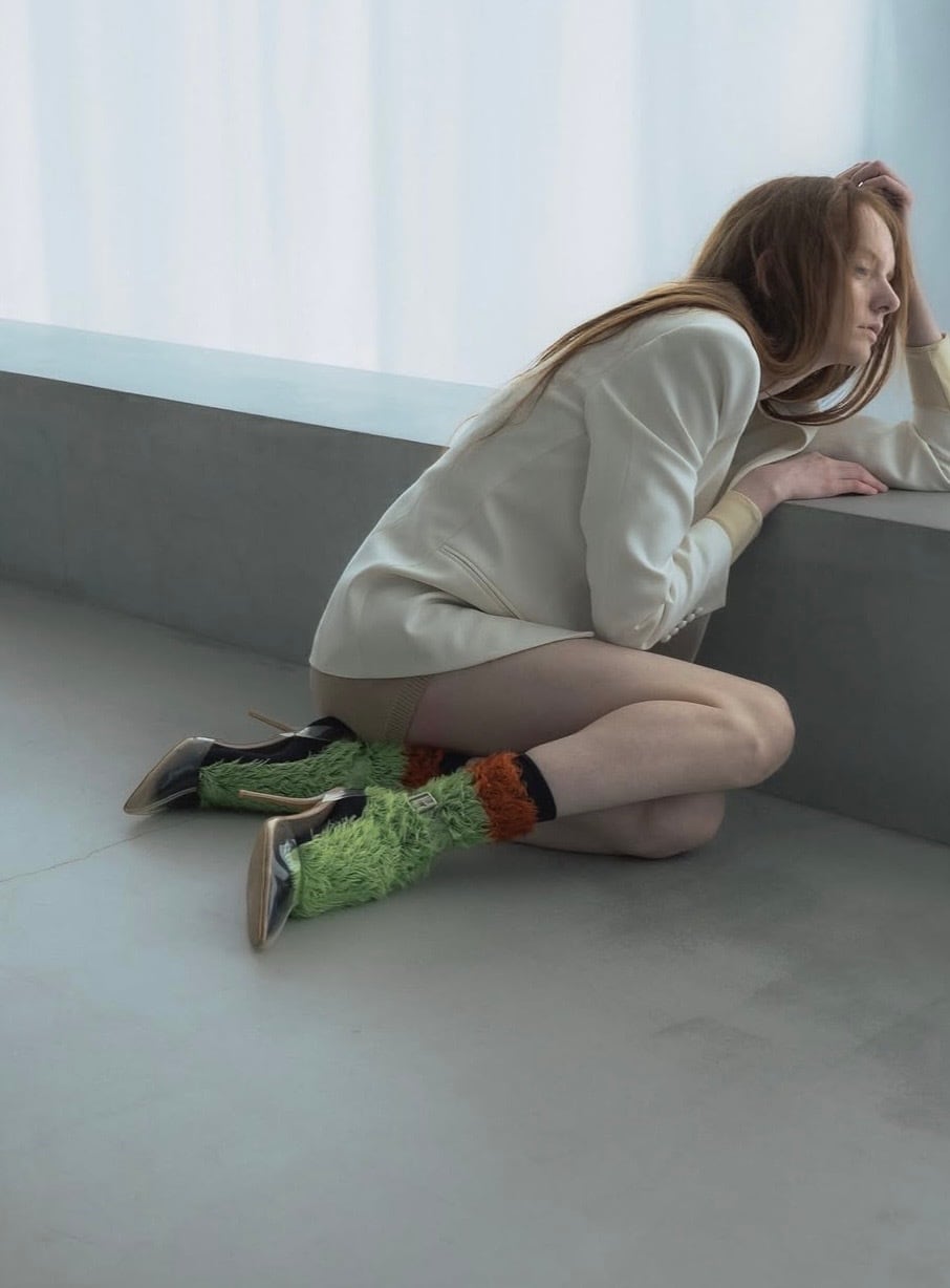 立体感のあるフリンジが軽やかに揺れ、シンプルな装いにも存在感与える配色ソックス