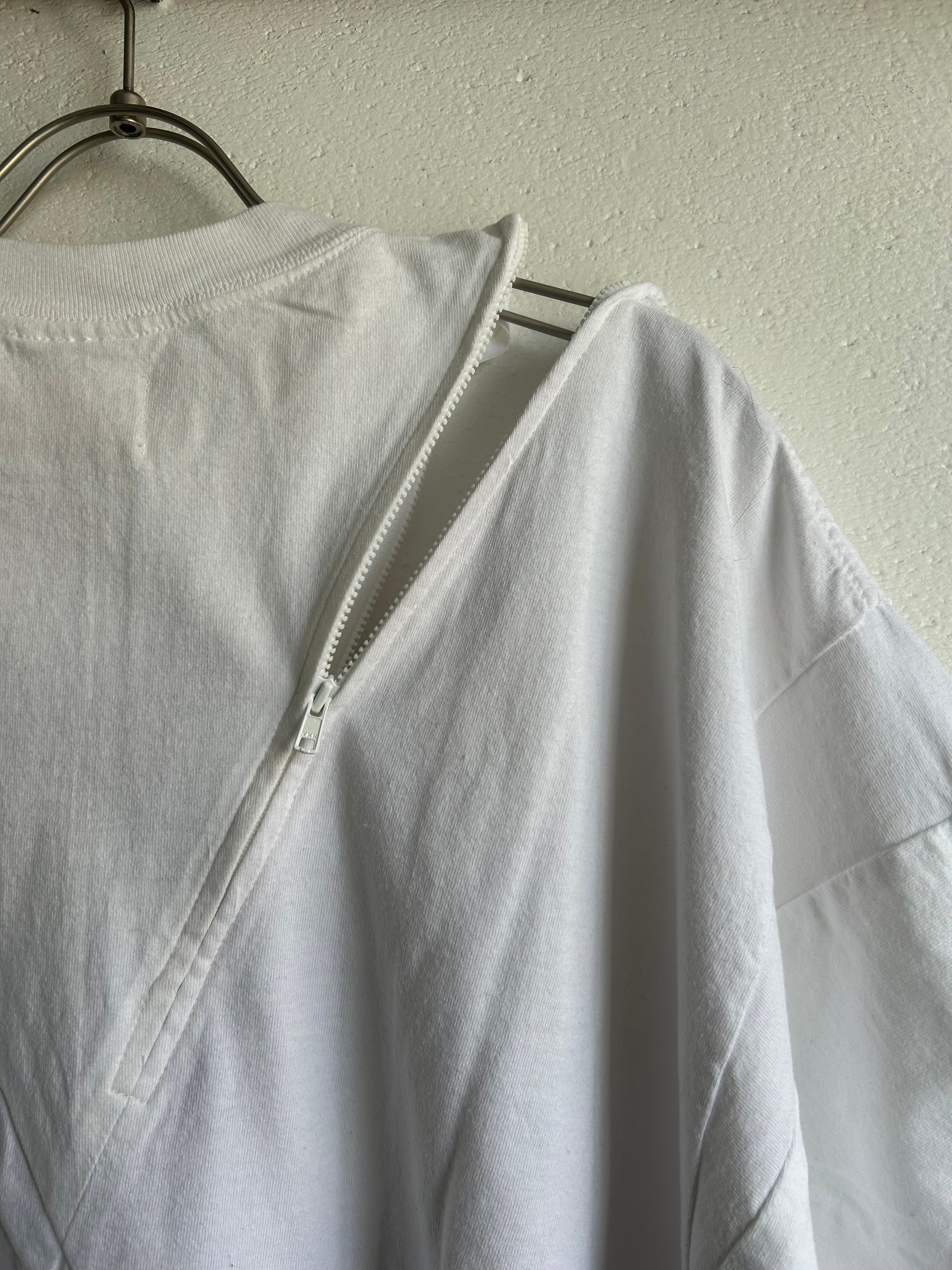 クロス切り替え右身頃前後にZIPを配し、BODYのネックからZIPを開けて首を出しても着用可能