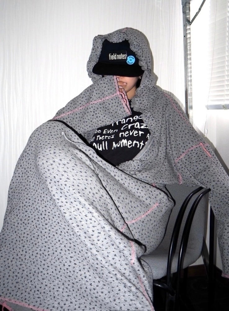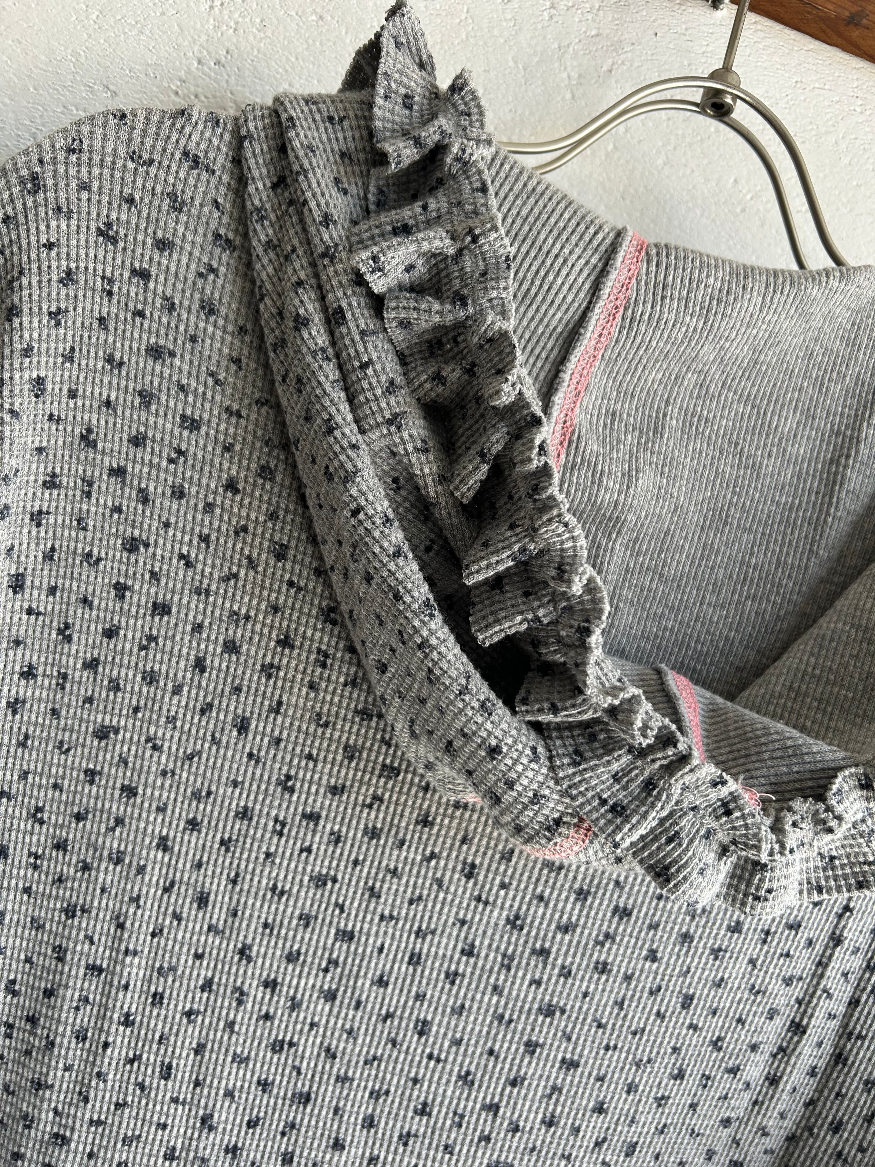 カジュアルな素材にフーディーとつながる前身にフリルをつけ、甘さのあるデザインに