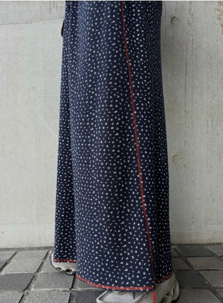 抽象的な柄とカラーステッチが特徴のロングワンピース