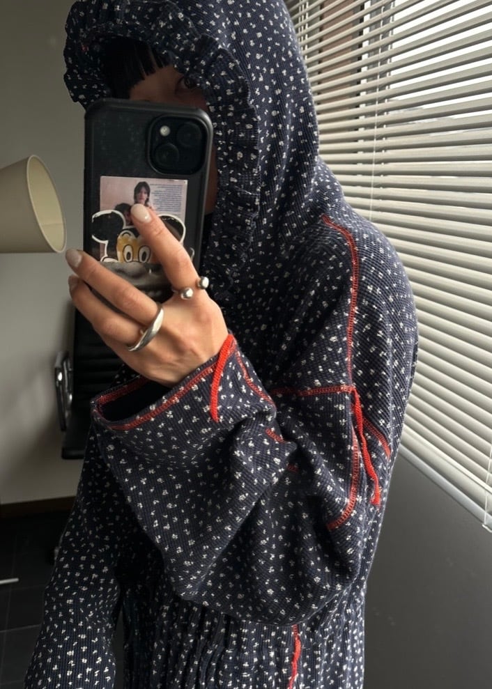 カジュアルな素材にフーディーとつながる前身にフリルをつけ、甘さのあるデザインに